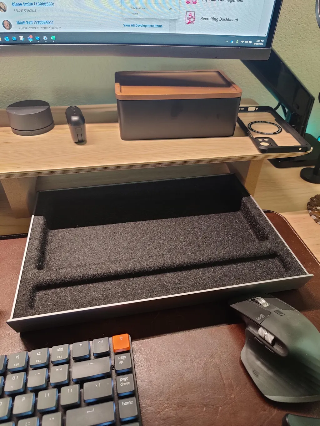 This premium storage drawer for the HumanCentric Desk Shelf upgrades your workspace in both storage and design. The felt-lined drawer offers a safe place to store small items, and the anodized aluminum finish is a perfect match for the HumanCentric desk collection.